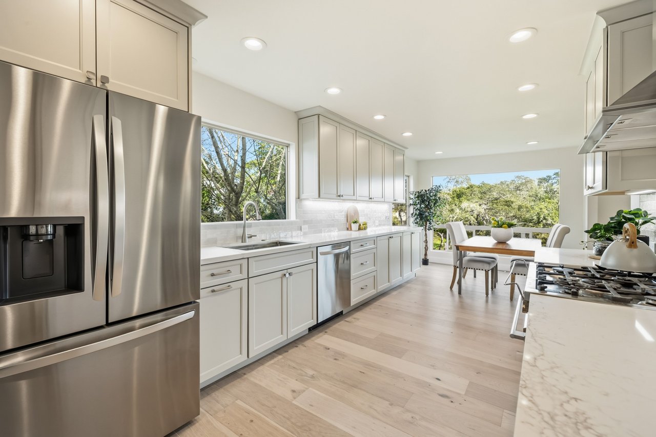 Tucked away in the quiet yet friendly neighborhood of Santa Cruz Gardens, this quintessential California 3-bed/3.5-bath home features fantastic curb appeal and stunning green belt vistas. Fully remodeled top to bottom with custom finishes, fresh coat of paint, new front door, and updated landscaping and hardscaping, including an inviting paver patio, set the stage for lazy afternoons enjoying a glass of iced tea on a warm spring day while greeting neighbors as they go by. The thoughtfully designed floor plan offers two primary suites upstairs, one of which provides beautiful views of the greenbelt. With the kitchen and dining room overlooking the living room, you wont miss a moment of fun while preparing a delicious meal in the gourmet kitchen as guests cozy up by the fireplace. Downstairs, youll find a third bedroom with its own private entrance, plus a bonus flex space complete with a wet bar and fireplace, perfect for a Mad Men-inspired home office, long-term guests, or multigenerational living. The home also offers incredible access to world-class outdoor recreation, including mountain biking, hiking, and surfing, as well as grocery stores, hospitals, major commute routes, and more.